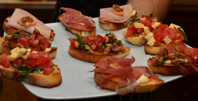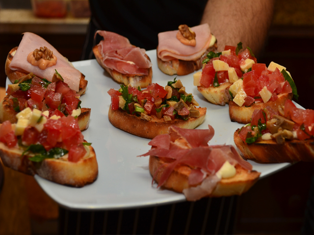 Bruschetas de Jamón Crudo y Tomate + Nachos con Guacamole + Montadito de Tortilla y Chorizo + Sandwichitos Gourmet + Papas Rústicas con Salsa de Quesos + Empanaditas.