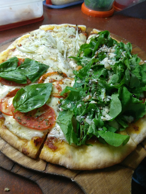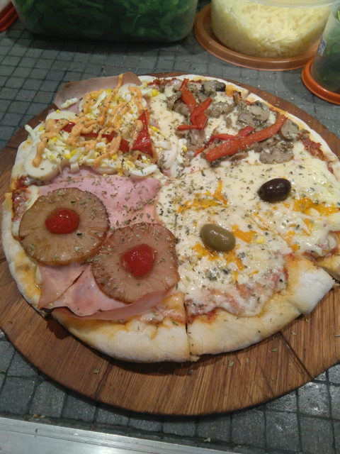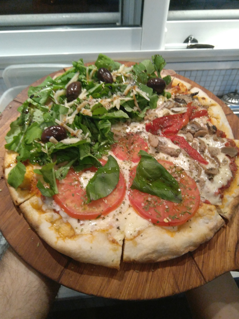 (Salsa de tomate, Muzzarella, Champiñones salteados, Morrones asados)